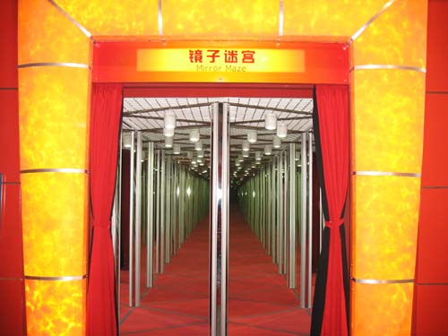这是一个根据平面镜成像原理设计、令我们产生视错觉的迷宫。迷宫由50面平面镜组成,并参照了诸葛亮的八卦阵进行布局。物体在经过镜子的反射后,在平面镜里形成了与事物等大等距的虚像。因此当我们拿着探路道具进入迷宫后,我们就会在镜子里看许多到一模一样的影像,从而产生视错觉,真假难辨。我们的任务就是要找到正确的道路并走出迷宫。这里要提醒大家注意的是,在迷宫里行走时要放慢脚步,请勿在迷宫内追逐打闹以免发生意外。