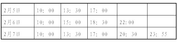 放映场次方面,暂定2月5日3场,6日4场,7日5场,场次时间安排如下: