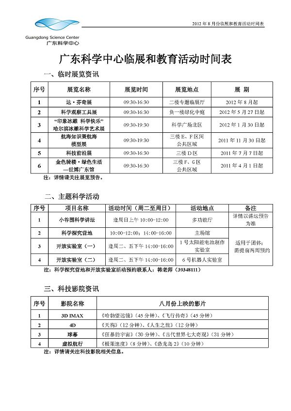 广东科学中心2012年8月份临展与教育活动预告,欢迎各位公众在游览前下载。