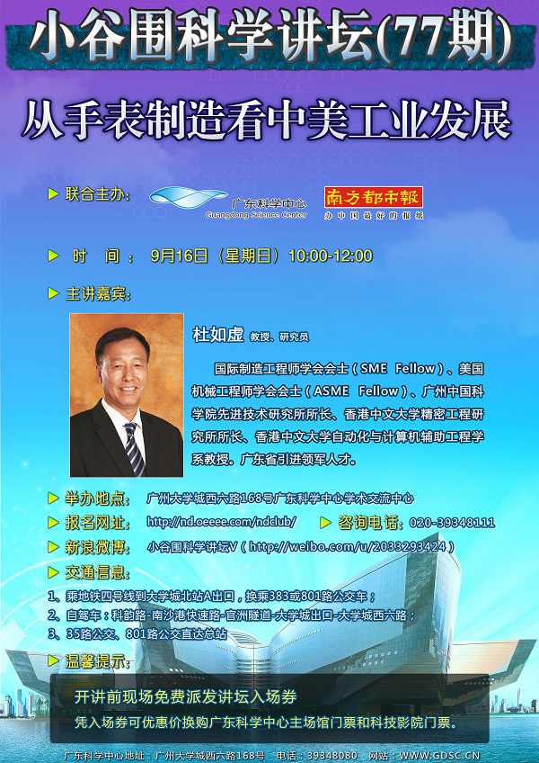优惠信息:开讲前现场免费派发讲坛入场券,凭入场券可优惠价换购广东科学中心主场馆门票和科技影院门票。