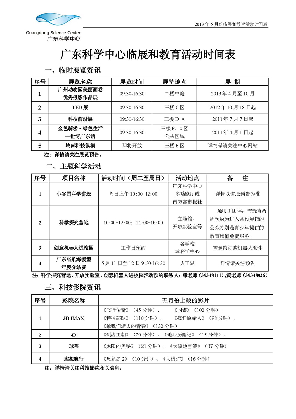 广东科学中心2013年5月份临展与教育活动预告,欢迎各位公众在游览前下载。