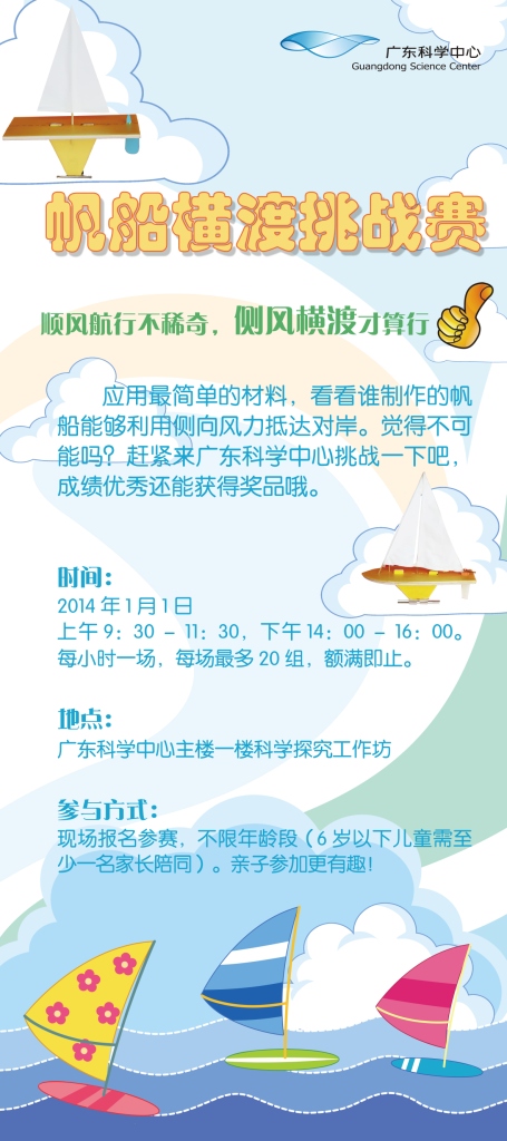 2014年元旦去哪里?来广东科学中心参加帆船横渡挑战赛吧!看看谁制作的帆船最会利用侧风航行,成绩优秀还能获得奖品哦。