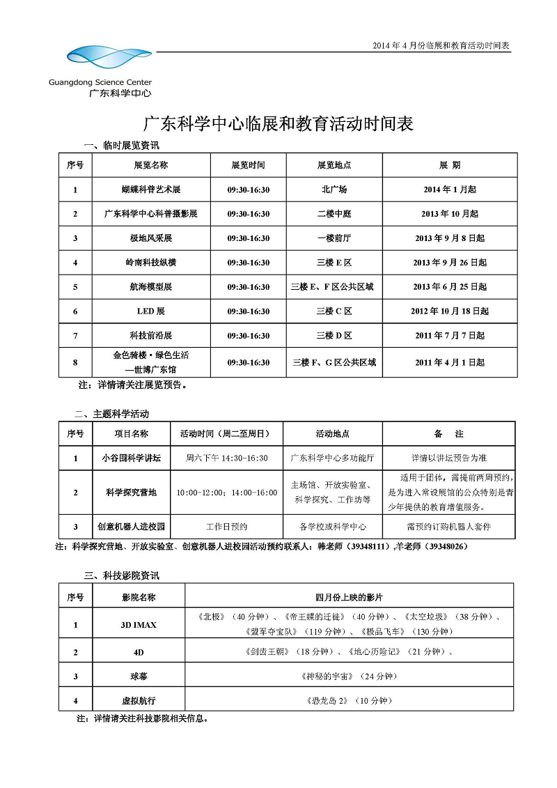 广东科学中心2014年4月份临展与教育活动预告,欢迎各位公众在游览前下载。