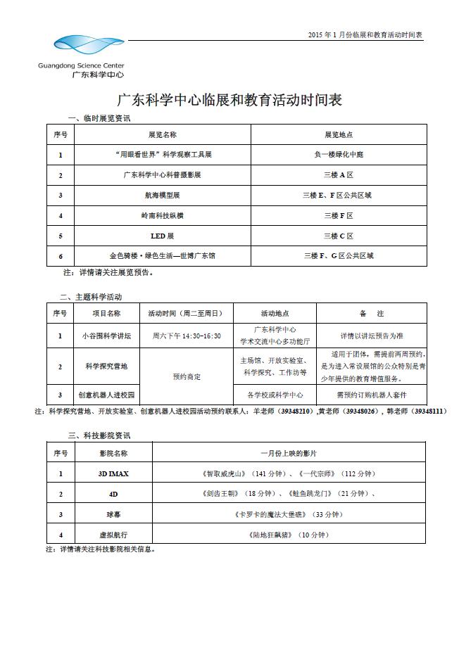 广东科学中心2015年1月份临展和教育活动预告