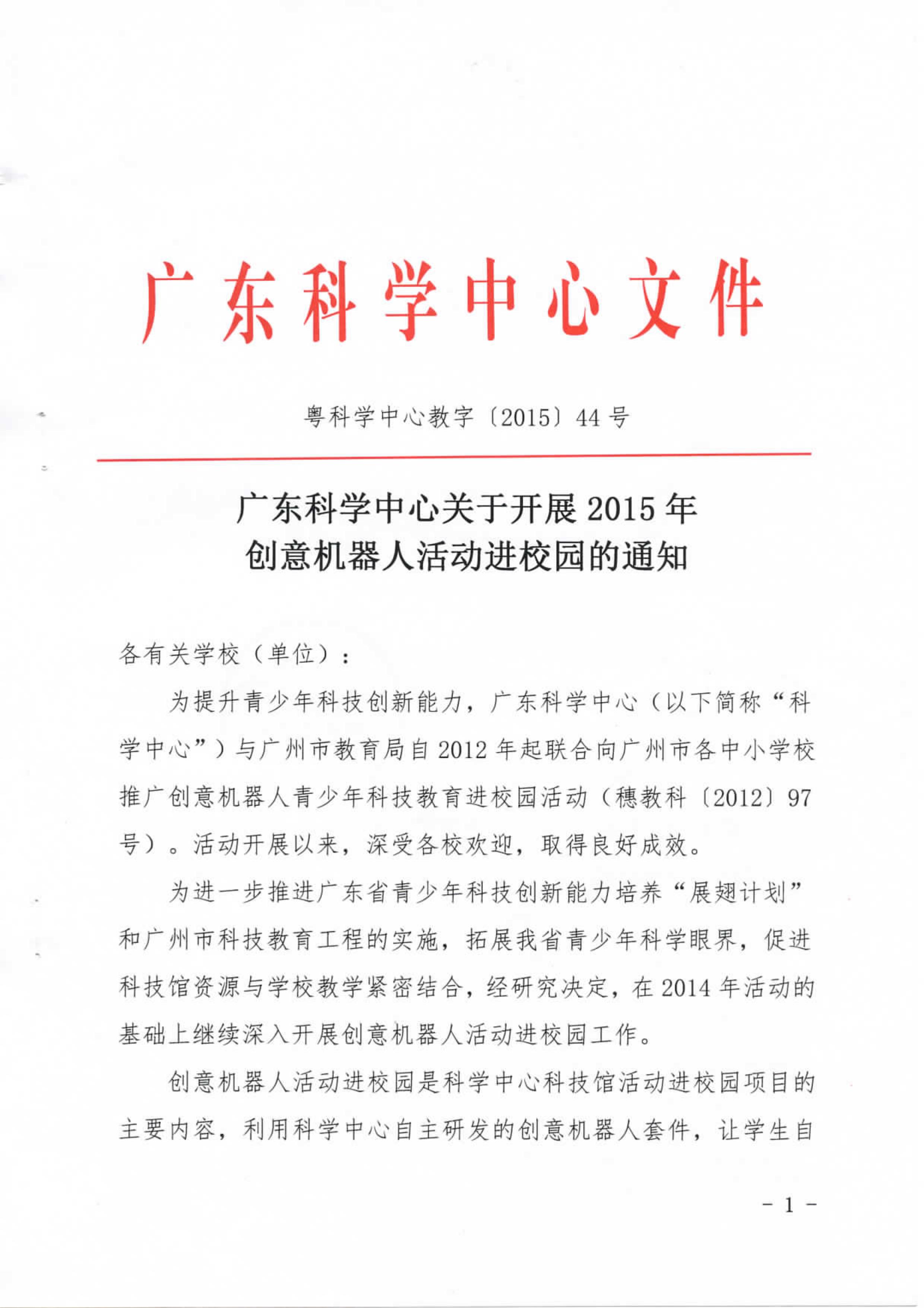 广东科学中心关于开展2015年创意机器人活动进校园的通知