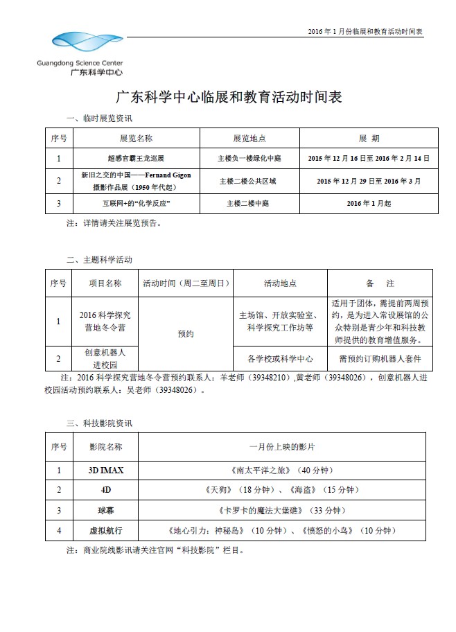 2016年1月份临展和教育活动时间表