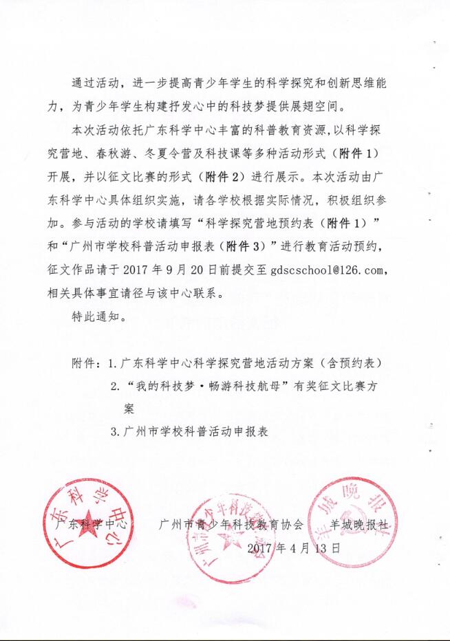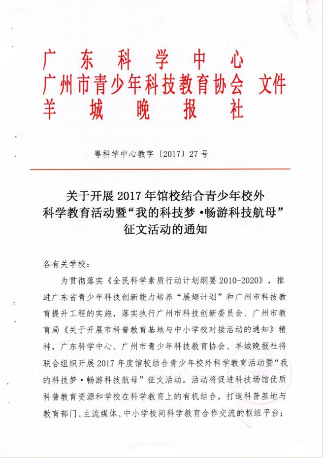 关于开展2017年馆校结合青少年校外科学教育活动暨“我的科技梦·畅游科技航母”征文活动的通知