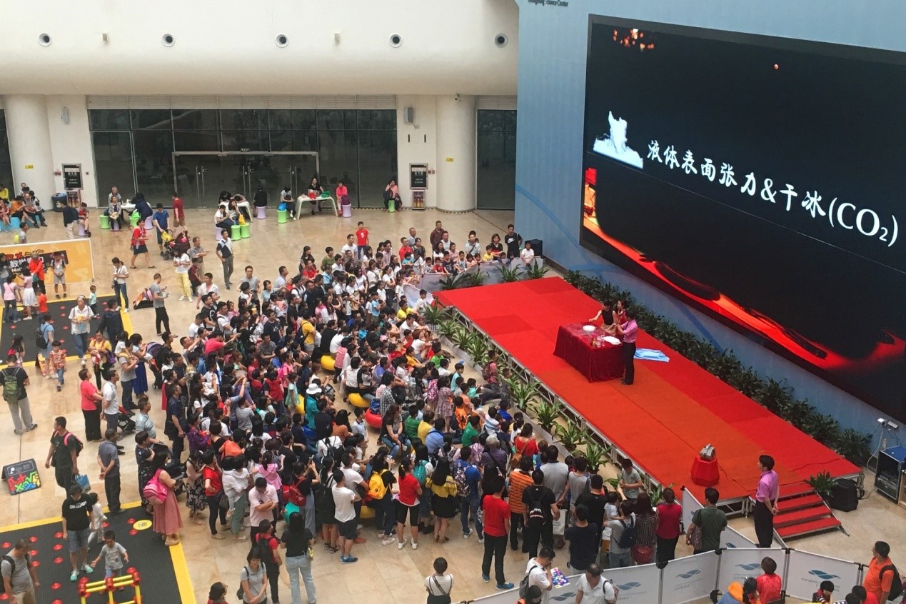 假日期间,科学中心绿化中庭的科学表演台全新开放,“万万没想到”、“我与科学有个约会”、“最佳拍档”和“大气压”等5个精彩的科学表演秀每天轮番上演。观众被一个个富有观赏性和趣味性的科学实验表演深深吸引,把舞台周边里三层外三层地围得水泄不通,不时传出阵阵感叹声、欢笑声和热烈的掌声。一位姓肖的观众表示,这样的科学表演太精彩了,一个气球、一块布、一根绳,表演人员使用生活中常见的物品,以孩子们喜闻乐见的舞台形式、爆笑的动作语言和简单易懂的表演方式生动传播科学知识,揭示科学奥秘,这对激发孩子科学好奇心与探索欲有很好的作用。