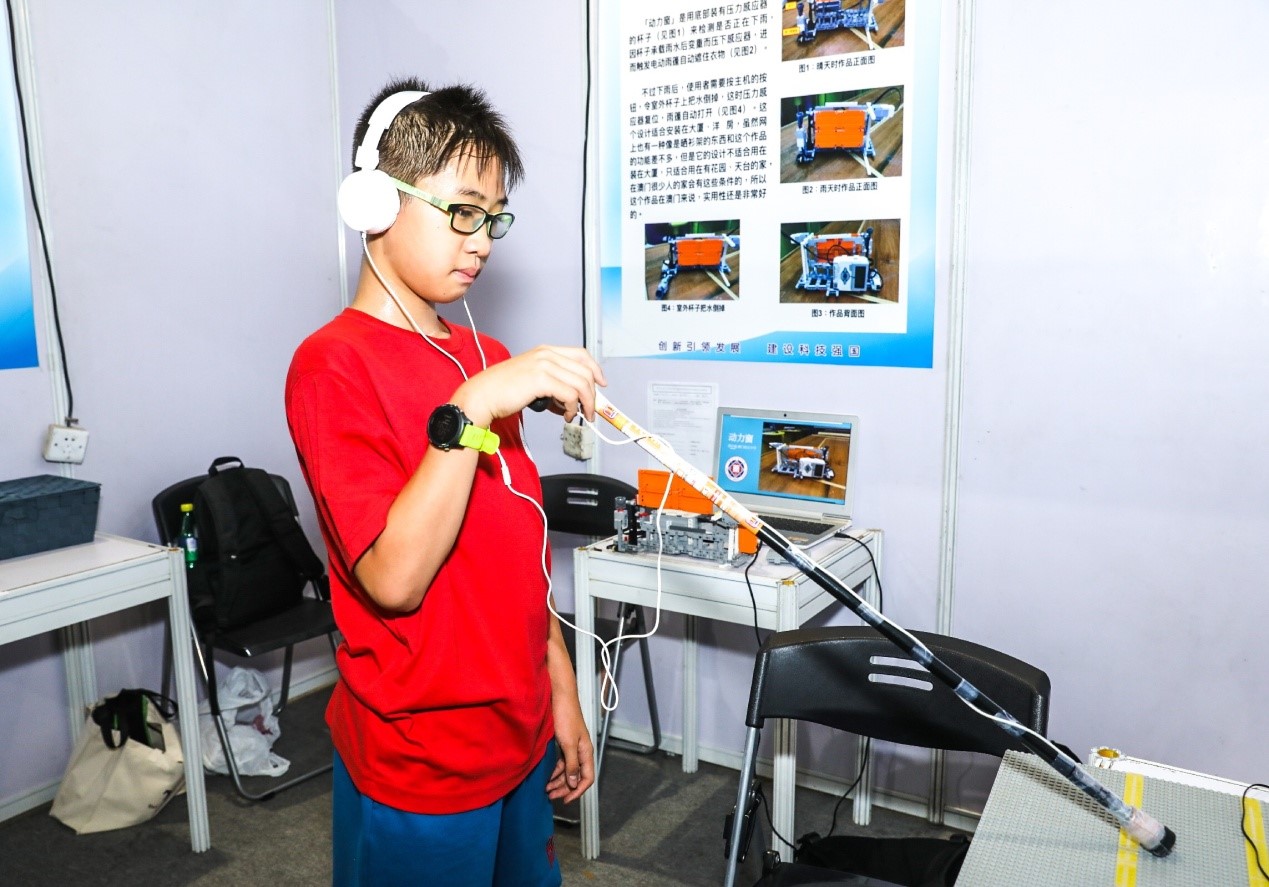 澳门小学生演示为盲人发明的智能拐杖