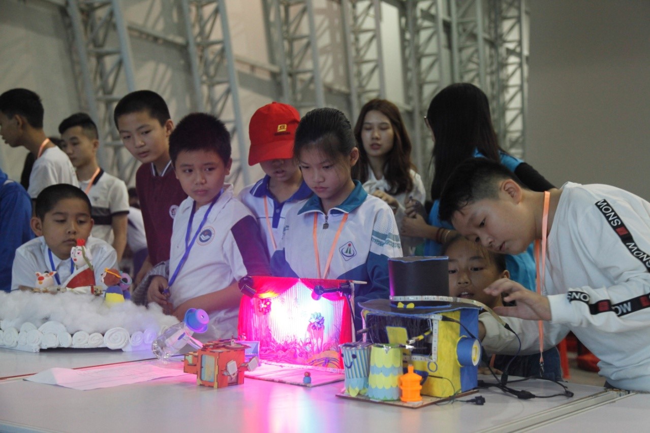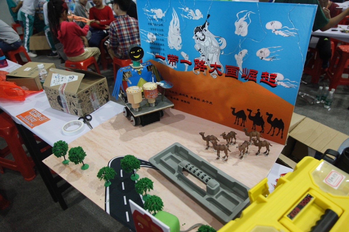 广州市越秀区文德路小学的一组参赛队伍,以“一带一路”作为作品创意主题,用木头手工制作的演奏小人惟妙惟肖,在浓浓的古丝绸之路场景中自动演奏着“一带一路走起来”的歌曲,非常生动。髻山创客队用3D打印技术,创作了一群Q萌“小黄人”,通过编程可以演奏十几个音符。阳江市第三中学几个有着旅行梦想的学生,一起创作的作品“一飞冲天”呈现了一个会演奏音乐的移动城堡,可以带着人们一边开演奏会一边环游世界。