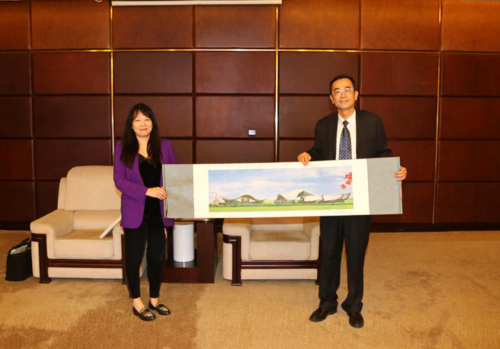 科学中心主任卢金贵与法国驻广州总领事馆周丽君总领事互赠礼品