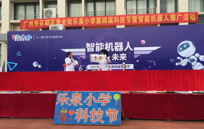 当天活动在庄严的升旗仪式中启动,广东科学中心的科学表演秀《万万没想到》点燃现场1500余名师生的探索科学的热情。由广东科学中心、花都区气象局气象天文科普馆、PiPaCode科技创客中心等单位带去的各项科普展示活动,吸引着同学们争先恐后地参与体验。早在活动开展前,科学中心创意机器人项目组就已给乐泉小学的同学们开展过相关培训。同学们把早已制作好的创意机器人带到现场展示和比赛,成为当天科学创作一角最出彩的活动内容。