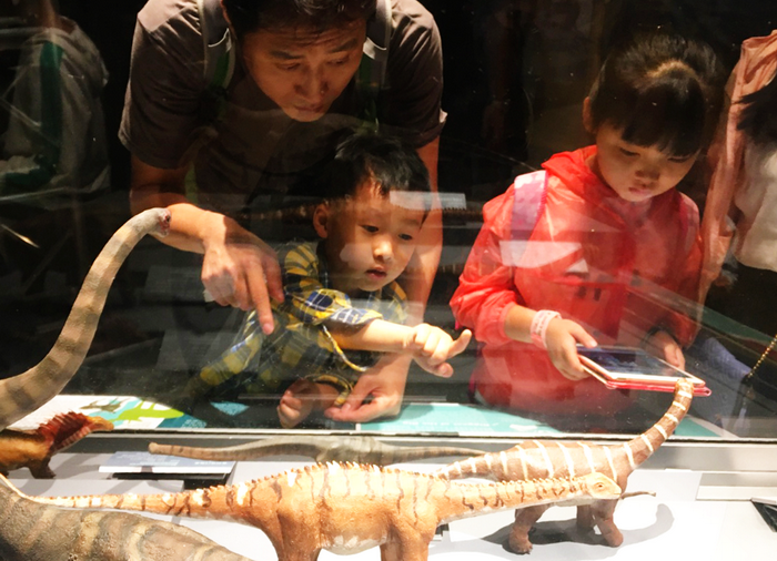 “世界最大的恐龙”展是广东科学中心与美国自然历史博物馆合作展出专题临展。展览除了向观众展示长颈长尾的蜥脚类恐龙骨骼外,还可以看到这些庞然大物的身体构造,揭示恐龙心率、呼吸、新陈代谢和繁殖等与其庞大体型之间的关系,给观众们带来别样的观展体验。在“恐龙”展厅内,尽管人头济济,却随处可见家长引领着孩子耐心讲解参观的“温暖有爱”的画面,矮个的孩子挤不过人群,骑在爸爸的肩头上“触摸恐龙”,高一点的小孩拖着父母在人群中穿梭,不断发出关于恐龙“为什么”的问号。广州游客刘女士表达,假期带孩子看科普展览,不仅能增长孩子的知识,还能提高孩子的观察力和动手能力,比宅在家里看电脑玩手机有意义多了。