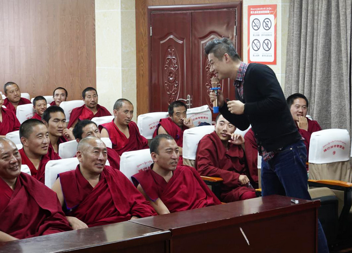 科普讲解员杨帆为当地寺庙僧人普及科学知识