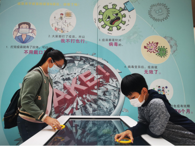 展览现场还配备了丰富精彩的教育活动。“病毒的装配”制作拼装病毒模型让观众可以直观地观察和了解病毒的组成结构;“抗原抗体对对碰”通过抗体匹配制作小游戏,观众可以学习抗体与抗原匹配结合的原理;“海报设计”让观众可以参与疫苗的贡献、疫苗的接种、疫苗的安全性、疫苗的生产等主题的海报设计,从中了解疫苗安全性、疫苗接种的注意事项等知识。