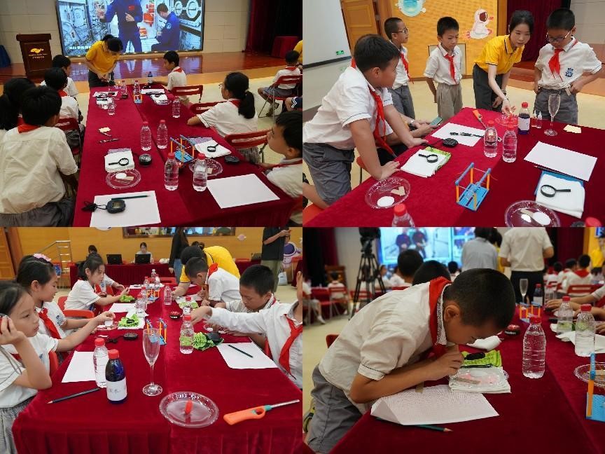 在小课堂现场,学生们在展教人员的耐心指导下,兴致勃勃地跟随航天员同步开展“球形火焰”“奇妙‘乒乓’”“动量守恒”“又见陀螺”实验。通过直播对比,学生们从天地实验的差异中感知宇宙奥秘、体验探索乐趣,学习浮力对流、材料疏水性等科学知识。